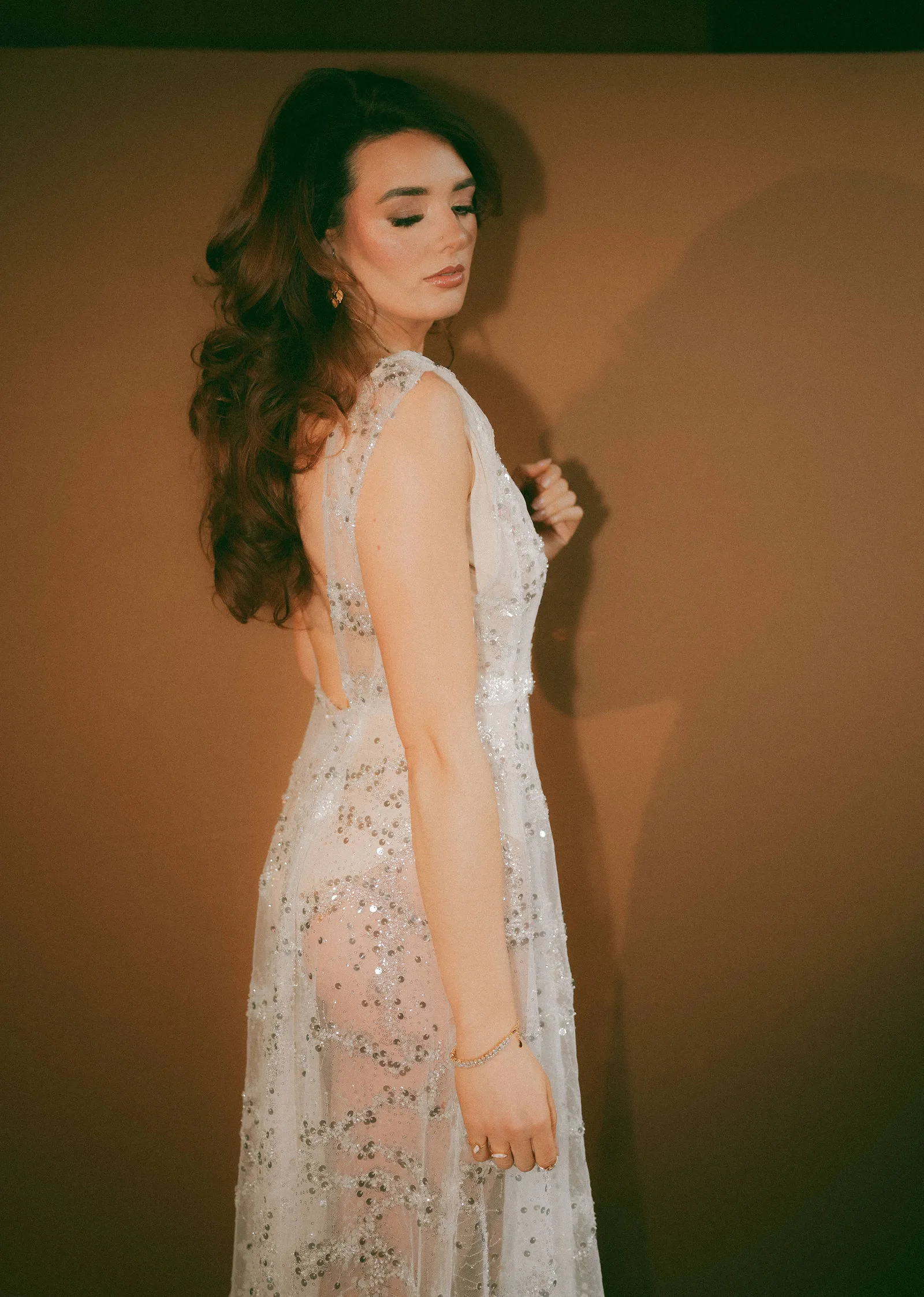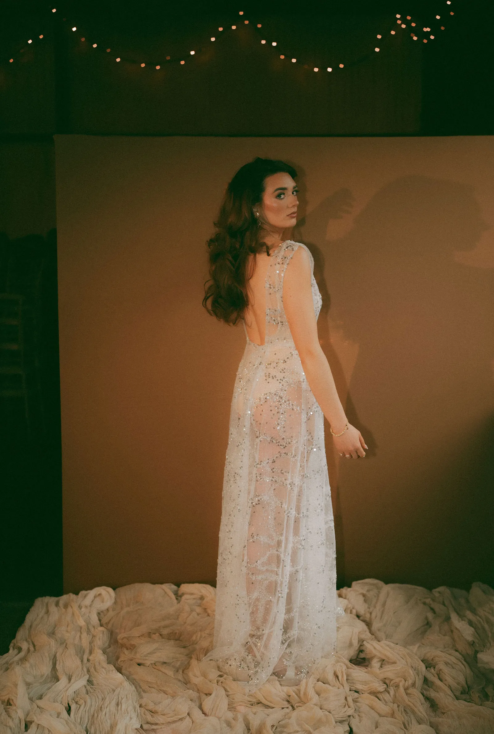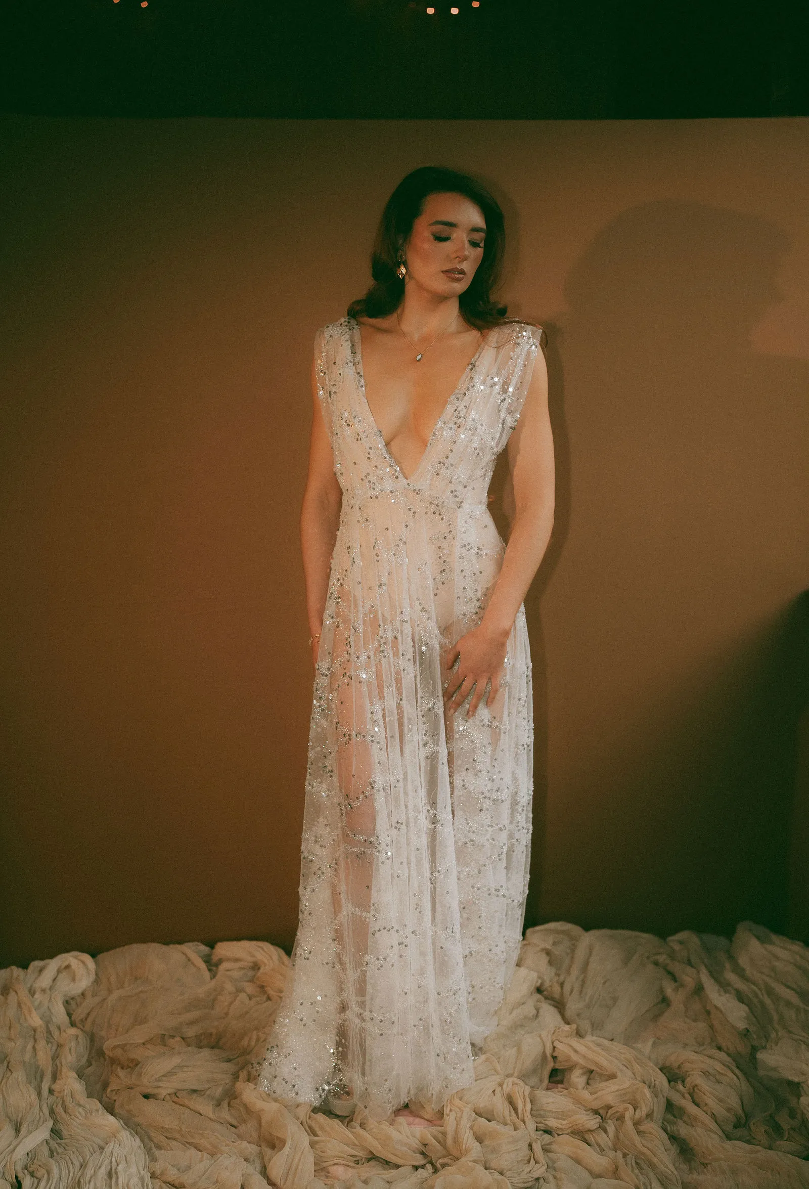 Part of the daring ensemble containing a diaphanous tulle maxi dress, lavishly encrusted with a shimmering interplay of beads and sequins. The look is completed with your choice of a nude bodysuit or a silky ivory half lining, both designed to preserve the gown’s sheer luminous brilliance. This look marries couture opulence with a bold, modern audacity. The Hera bride is fearless and unafraid to shine.